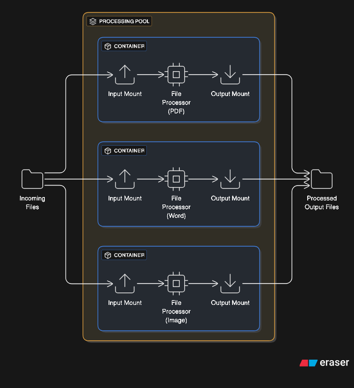 Implementations optimize with container pools, volume mounting strategies, and parallel processing. A service might maintain 100 idle containers ready to process files instantly, with containers recycled after handling a configured number of files to prevent resource leaks.