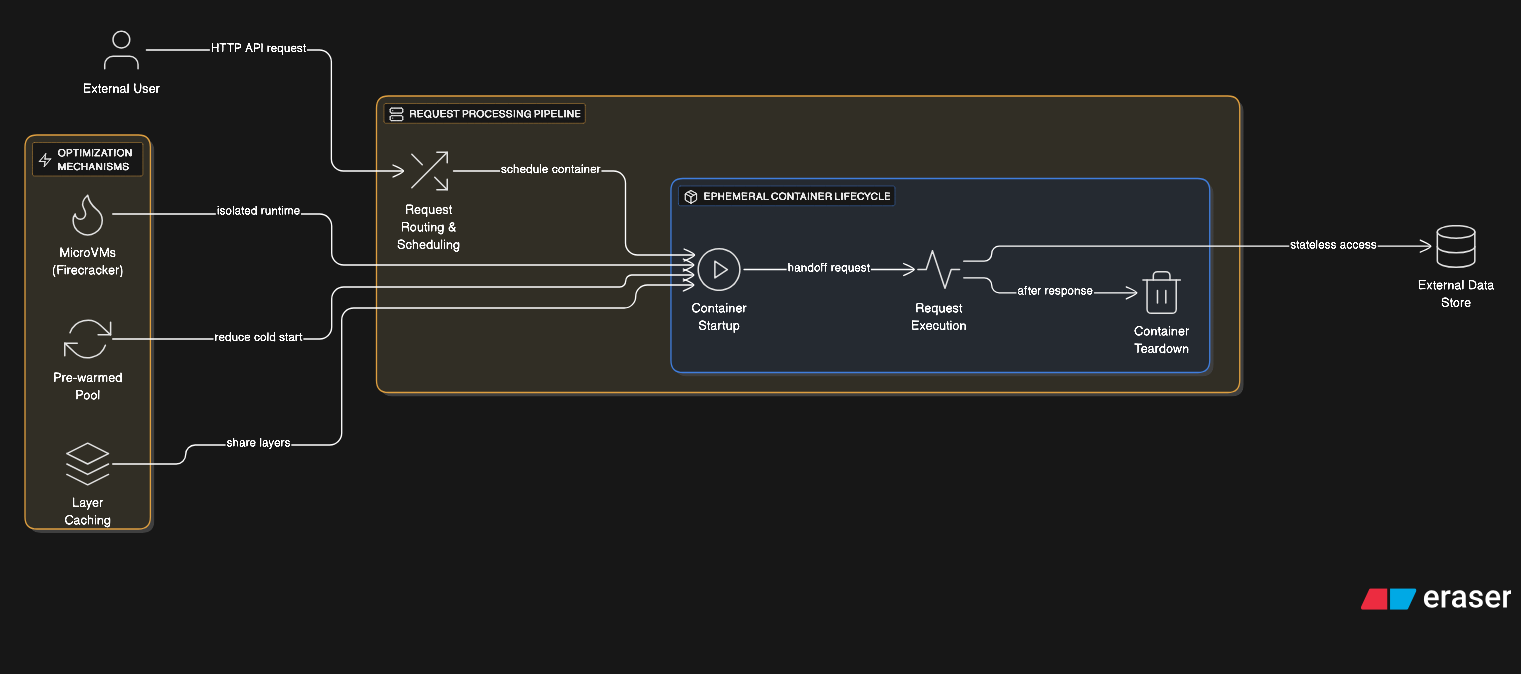 Optimizations for this pattern include pre-warmed container pools, aggressive layer caching, and checkpoint/restore functionality. Technologies like Firecracker combine container and microVM concepts for sub-second isolated environment startup. Container snapshots enable instant restoration to specific states without full initialization.