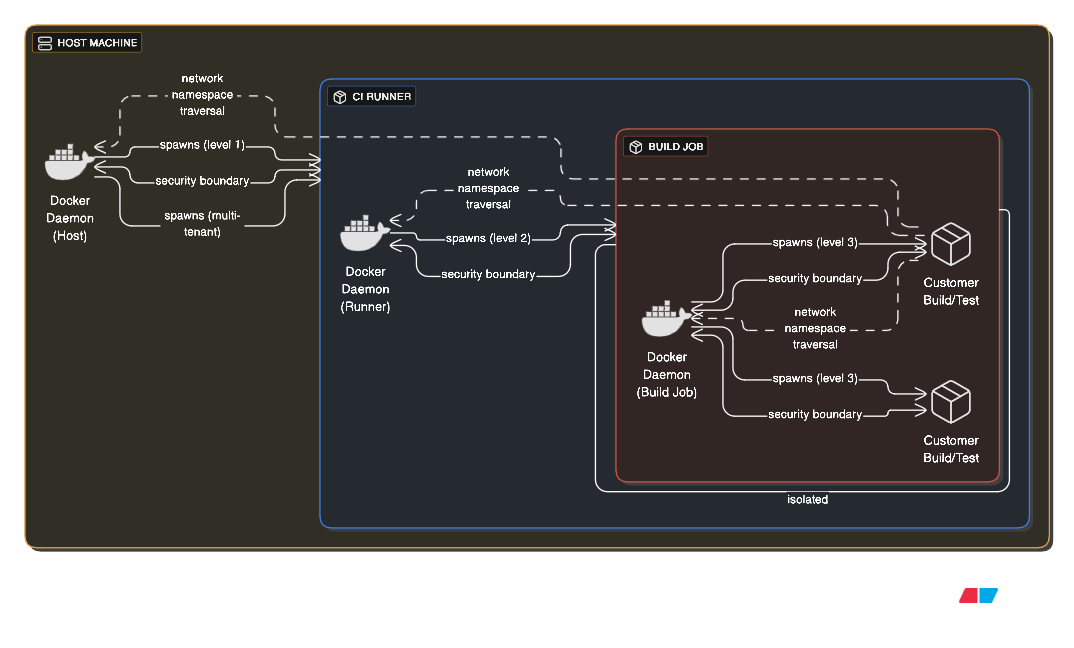 This extreme nesting creates massive complexity. Each layer adds overhead and potential failure points. Security boundaries become unclear as privileges cascade through layers. However, multi-tenant CI platforms sometimes use this to provide complete isolation between customer builds while allowing those customers to use Docker themselves.