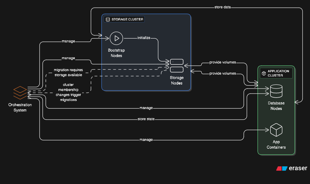This chicken-and-egg situation requires careful orchestration. Bootstrap containers initialize the distributed storage, then regular application containers consume it, including the storage system’s own persistent data. Storage cluster membership changes trigger container migrations, which depend on the storage being available during migration.