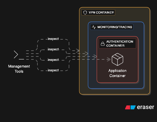 This pattern enables sophisticated security architectures. An application container sits inside a network policy enforcement container, which sits inside a monitoring container, which sits inside a VPN container. Each layer adds specific network behavior without modifying the application itself.